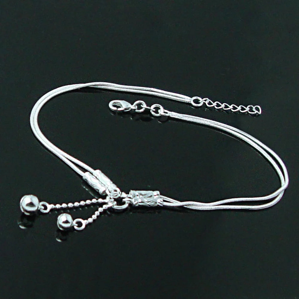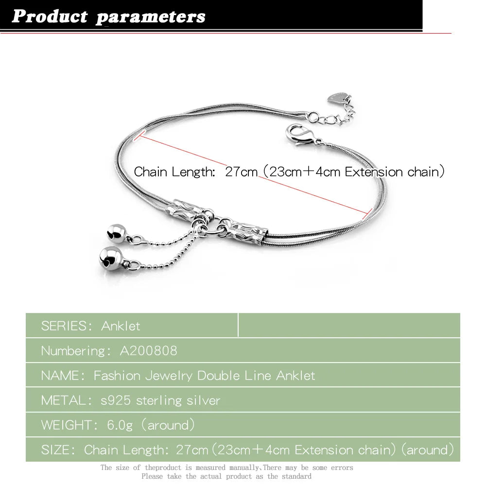 Fashion Cute Girl Bell Anklets Women Solid 925 Sterling Silver Snake Chain Anklets Contracted Double Chain 27cm Anklets Jewelry