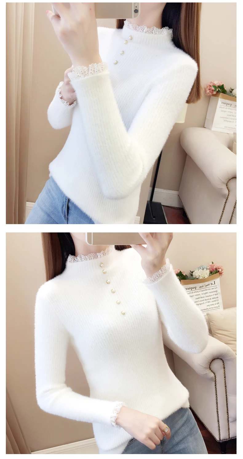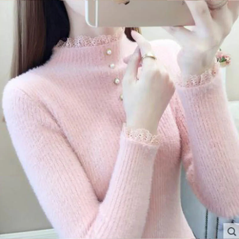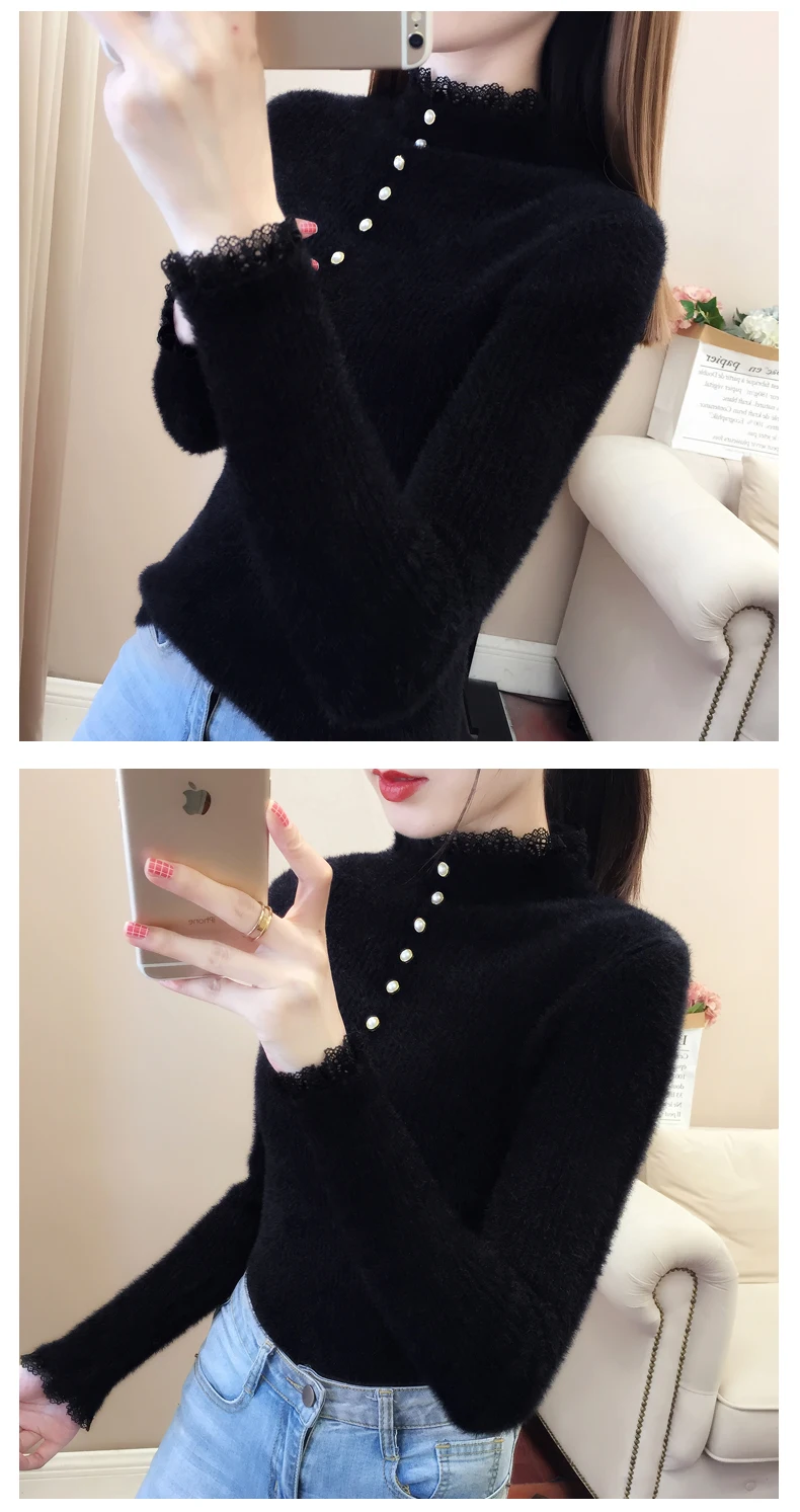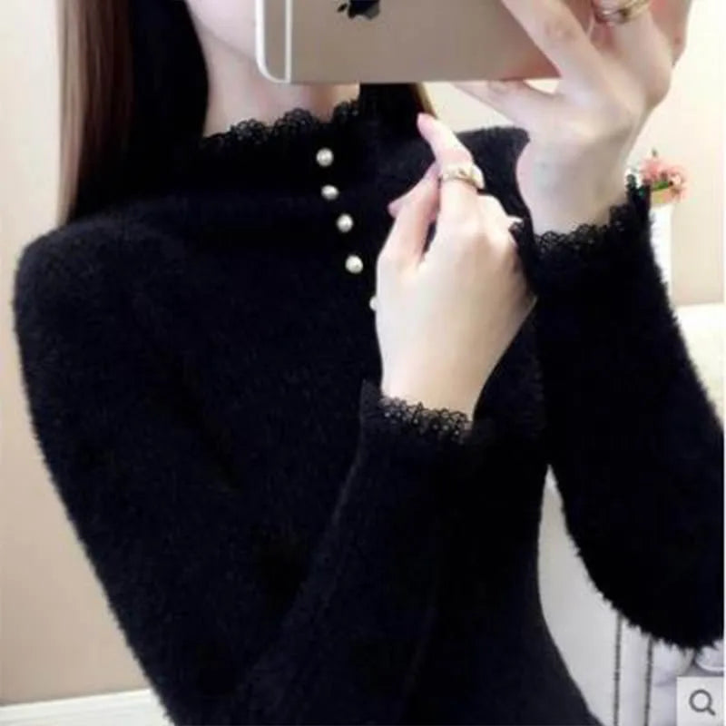 Women Clothing Elegant Fashion Half High Collar Long Sleeve Sweaters Autumn Winter Chic Fluff Solid Knit Pullovers Lace Edge Top