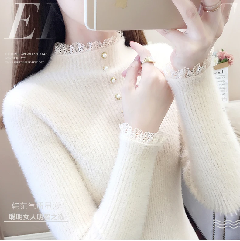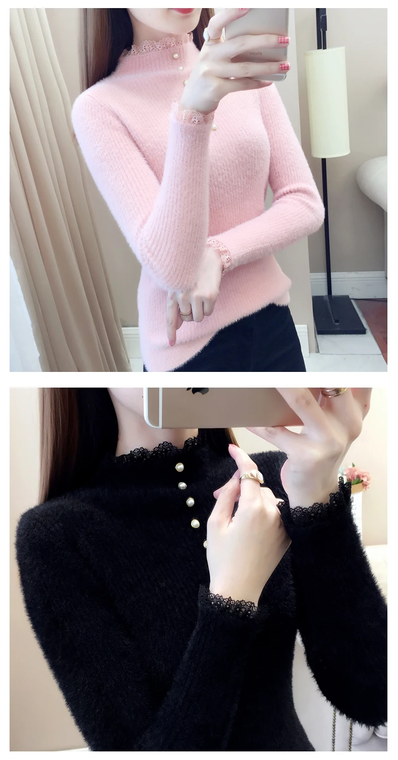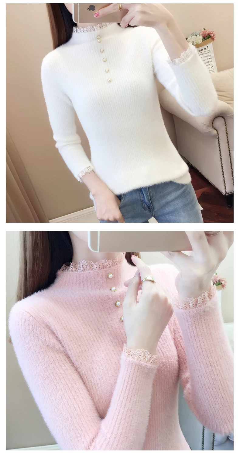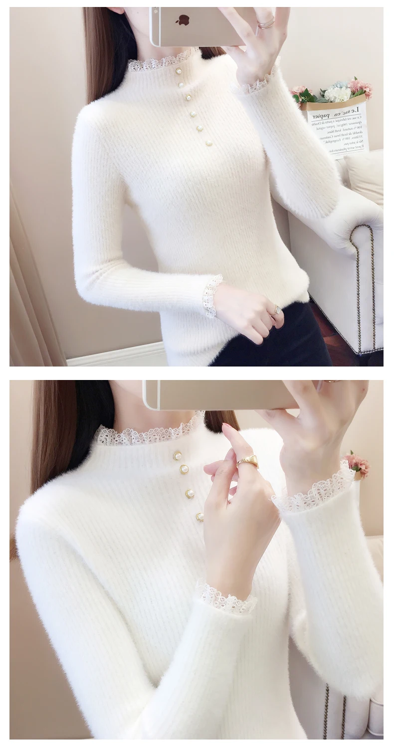 Women Clothing Elegant Fashion Half High Collar Long Sleeve Sweaters Autumn Winter Chic Fluff Solid Knit Pullovers Lace Edge Top
