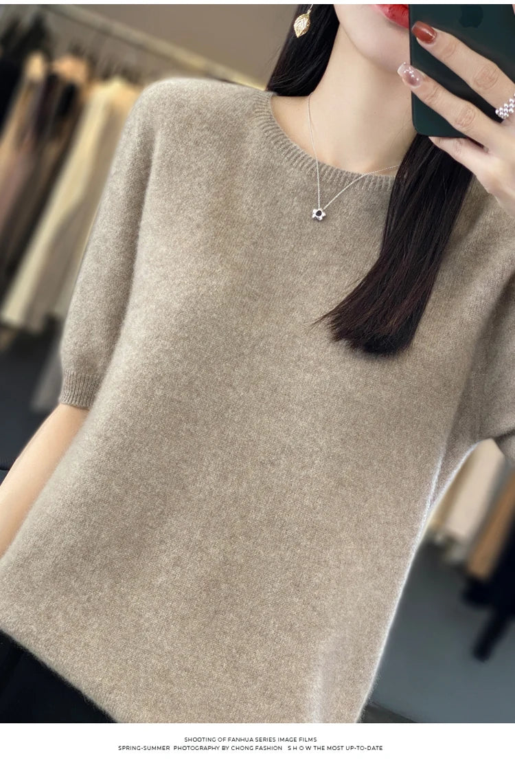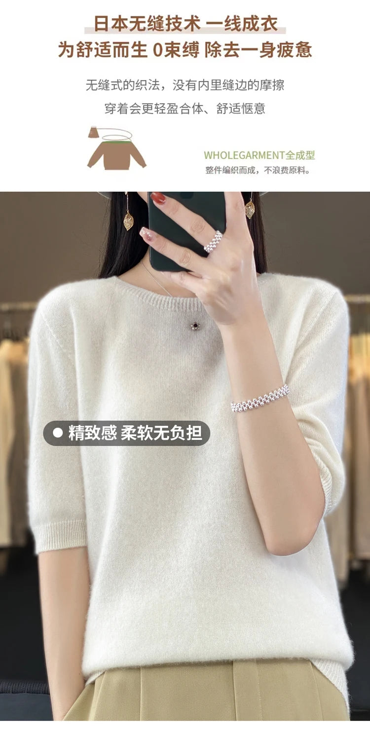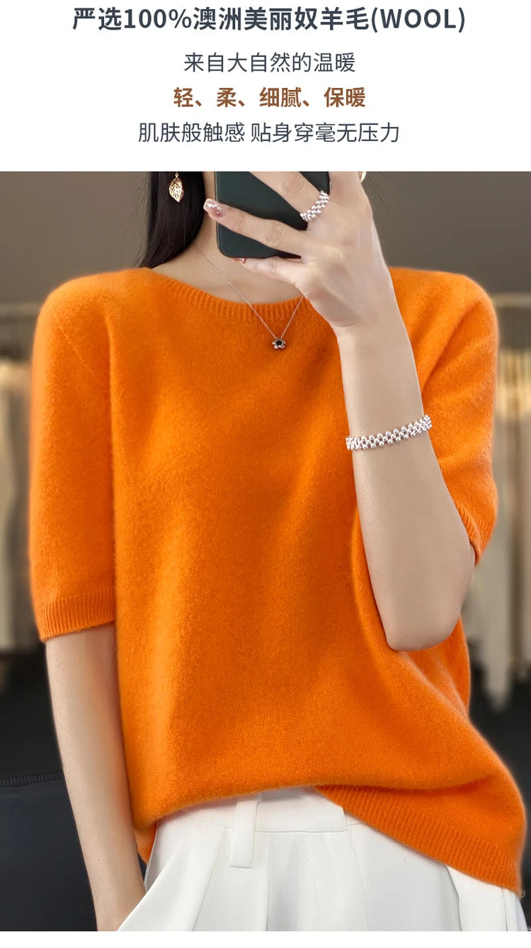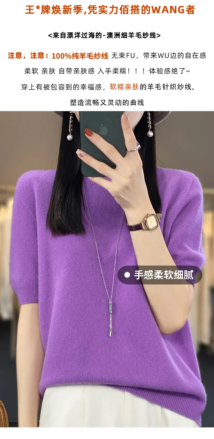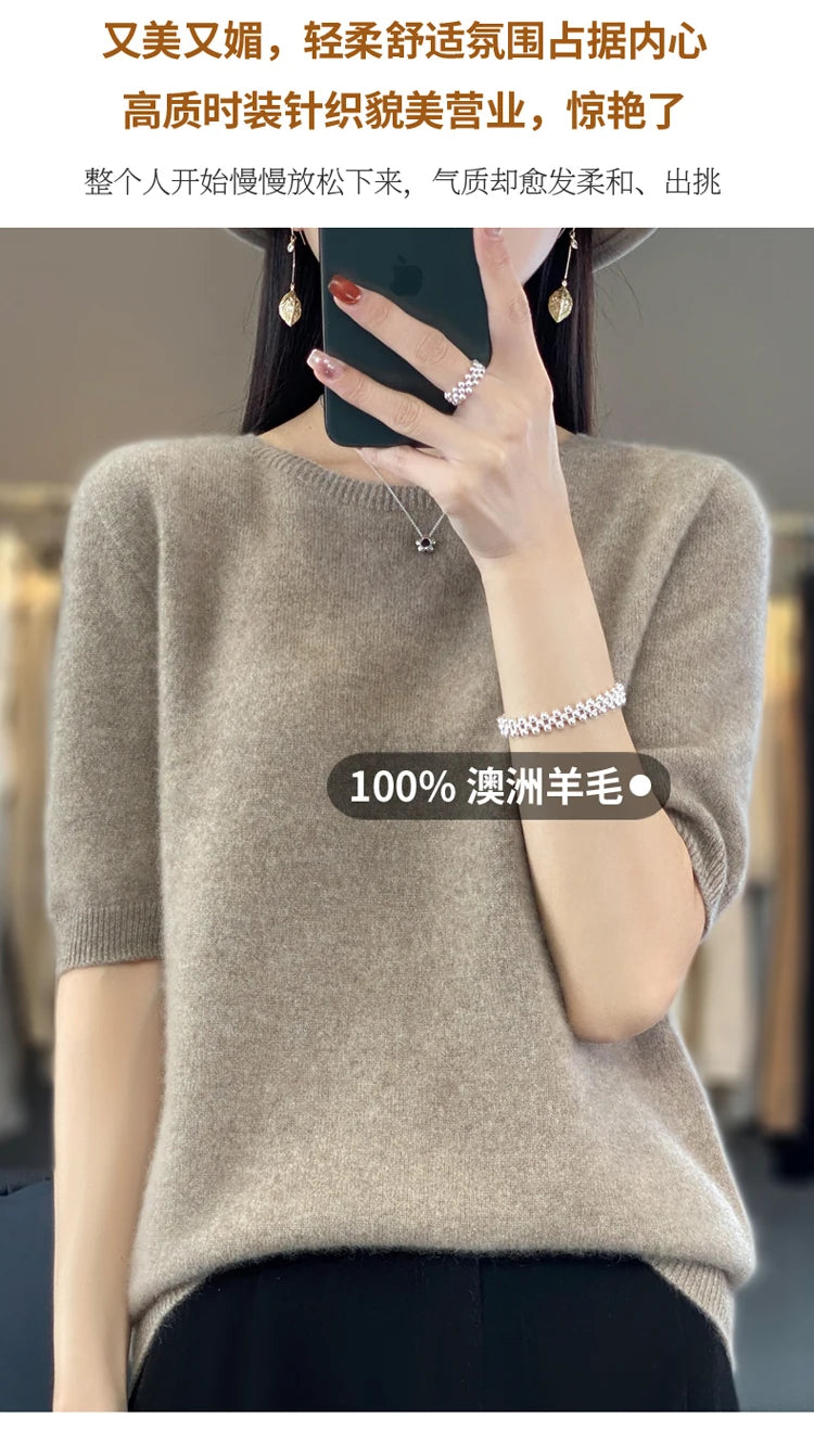 100% Pure Wool Women’s O-Neck Pullover T-Shirt – Spring Summer Loose Short Sleeve High-End Sweater Top