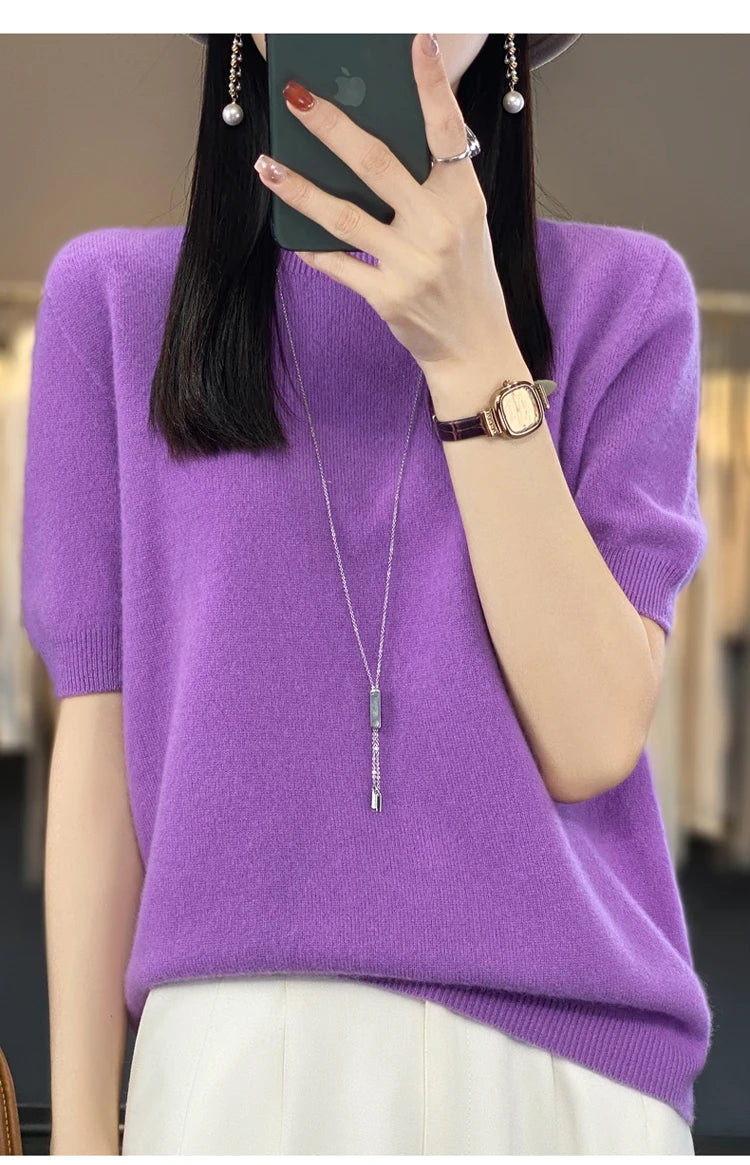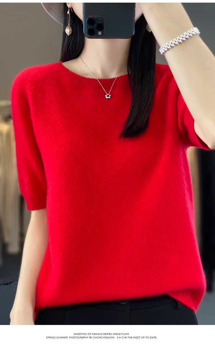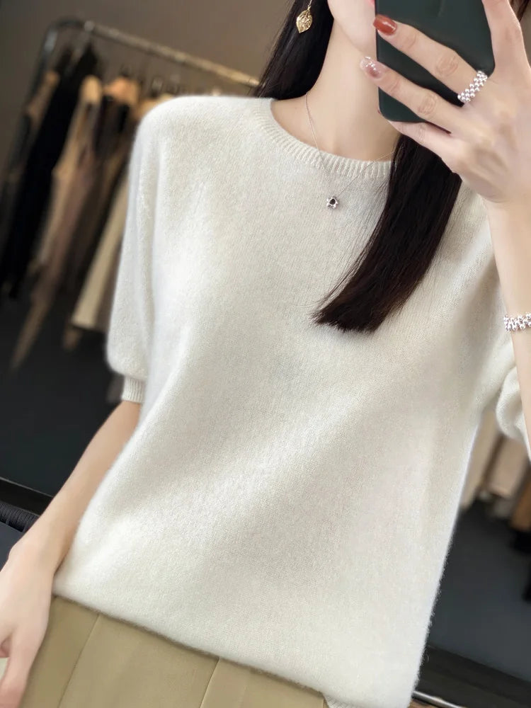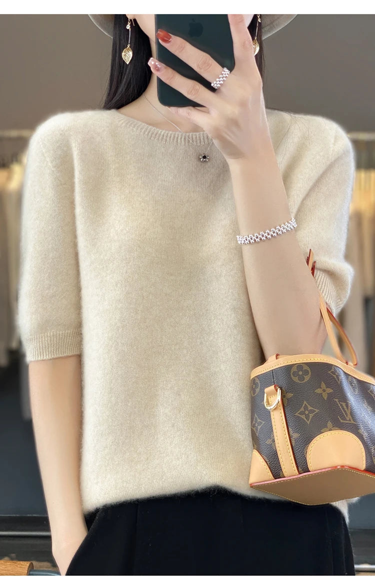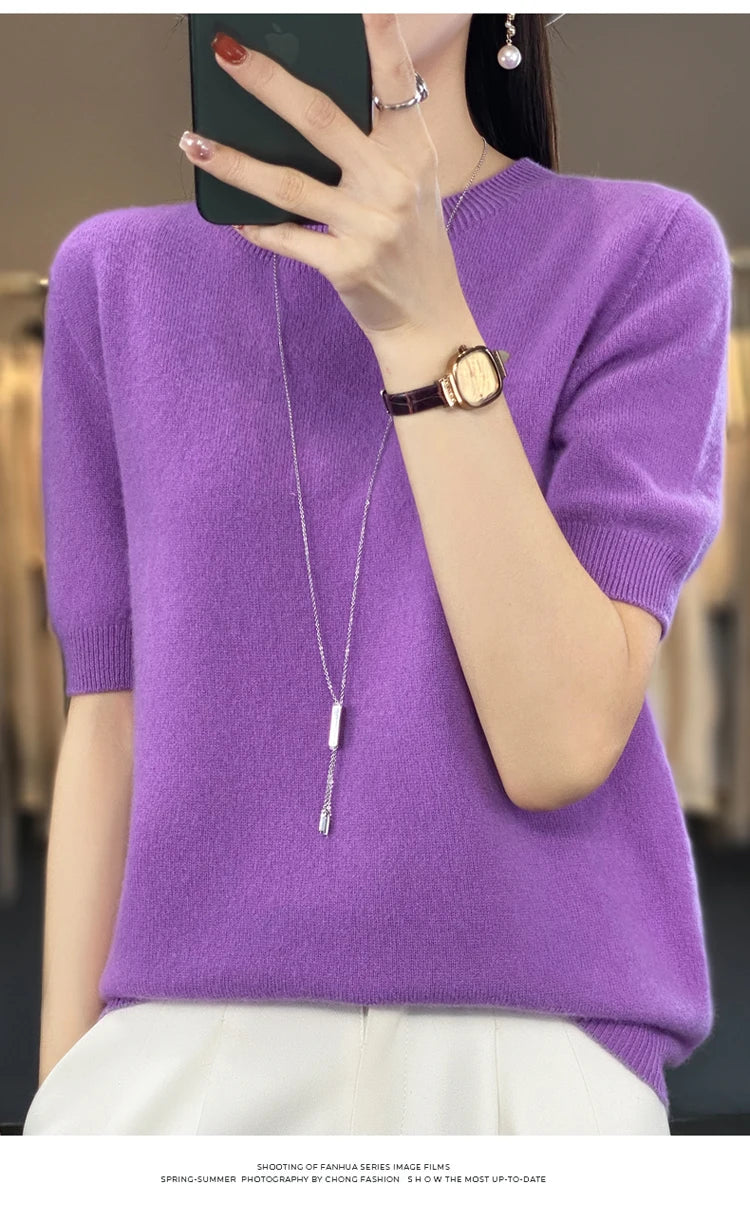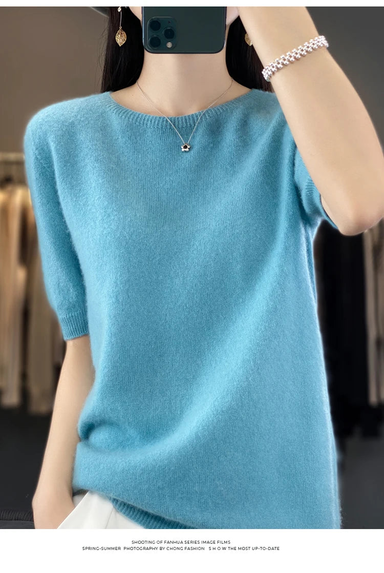 100% Pure Wool Women’s O-Neck Pullover T-Shirt – Spring Summer Loose Short Sleeve High-End Sweater Top