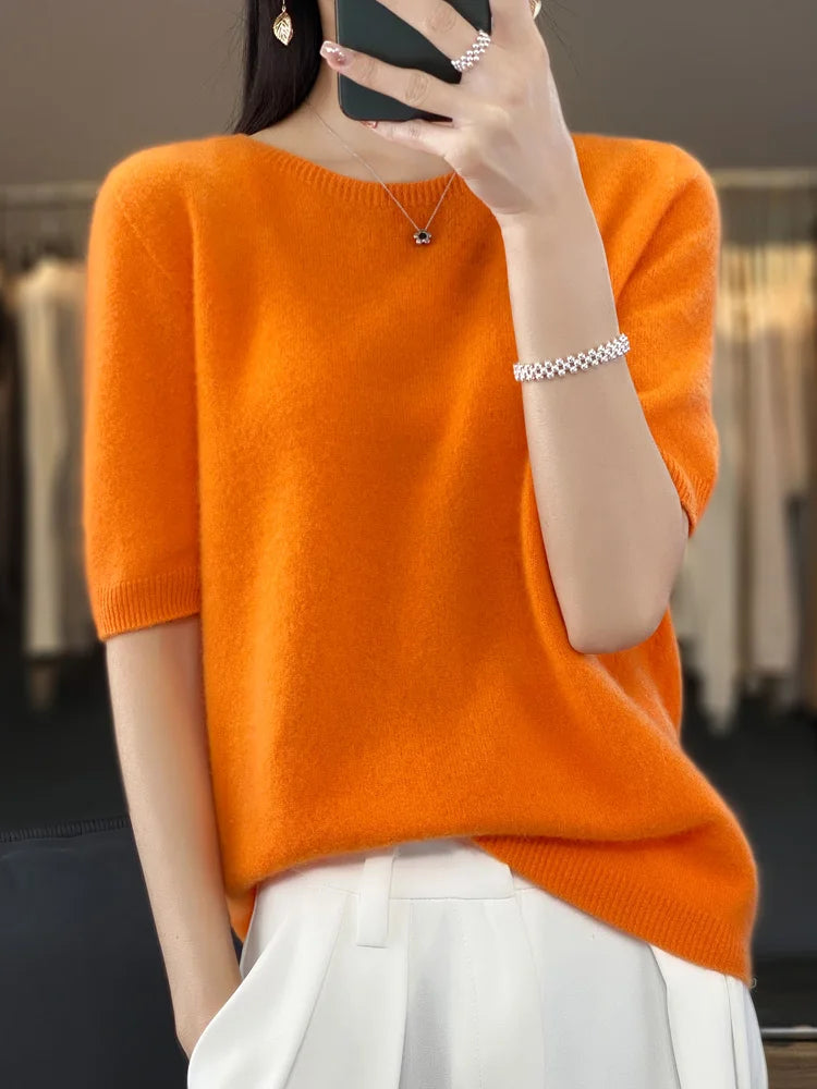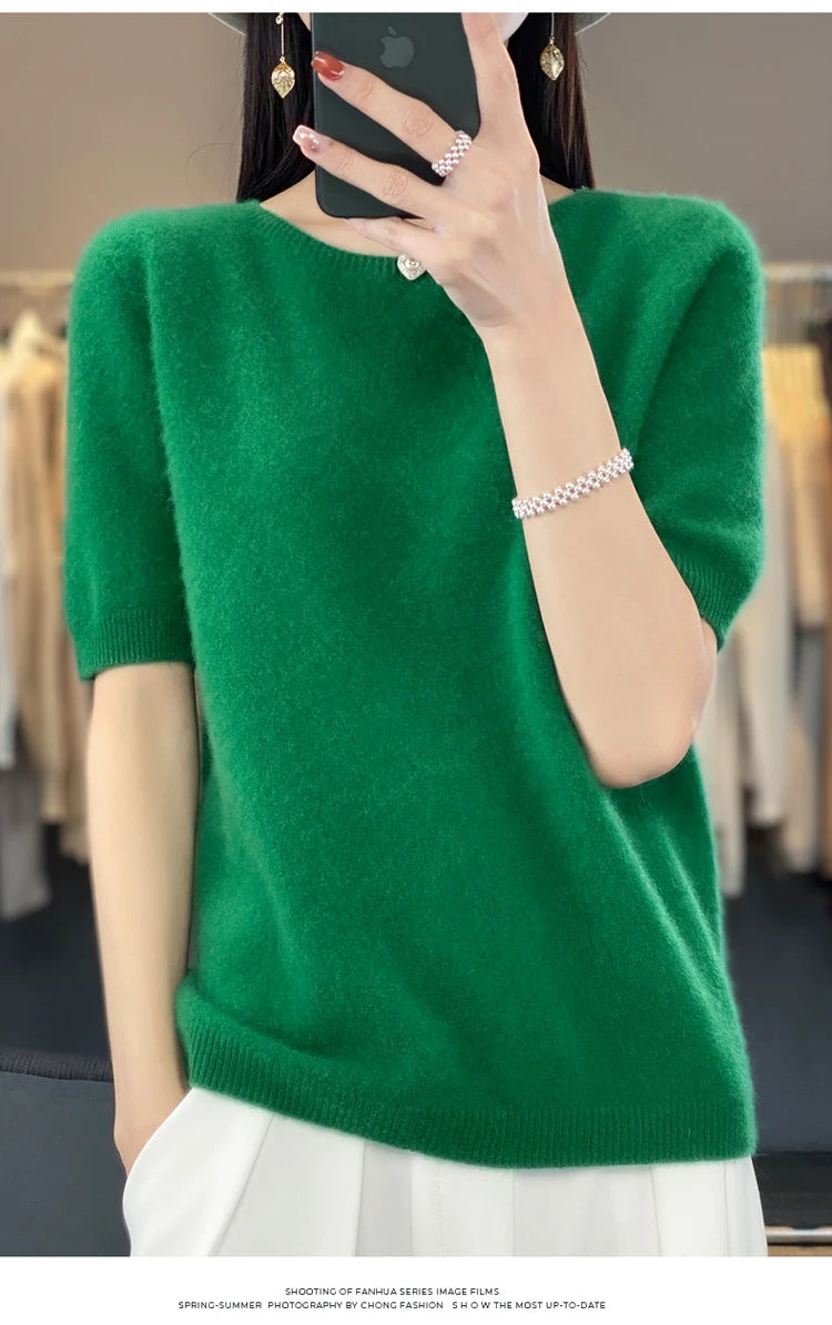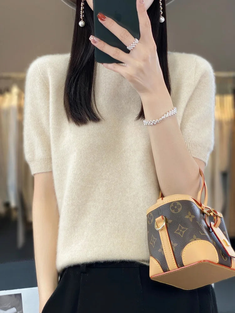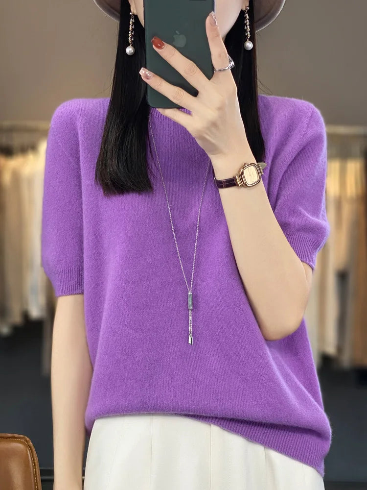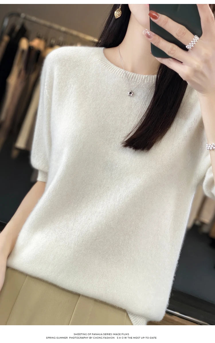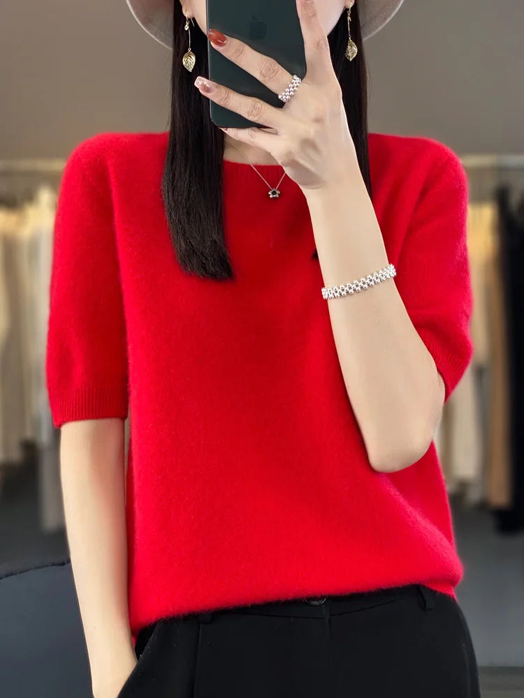100% Pure Wool Women’s O-Neck Pullover T-Shirt – Spring Summer Loose Short Sleeve High-End Sweater Top