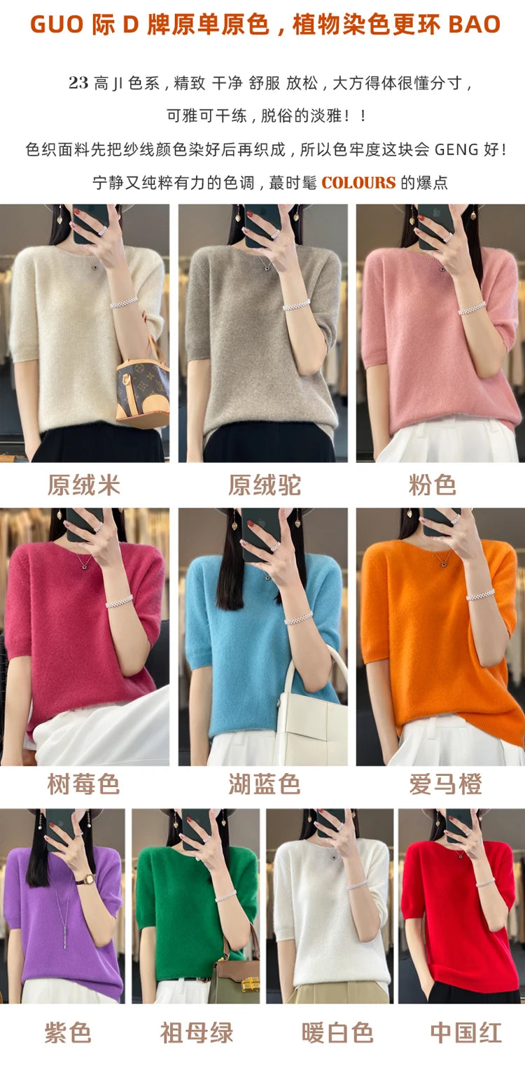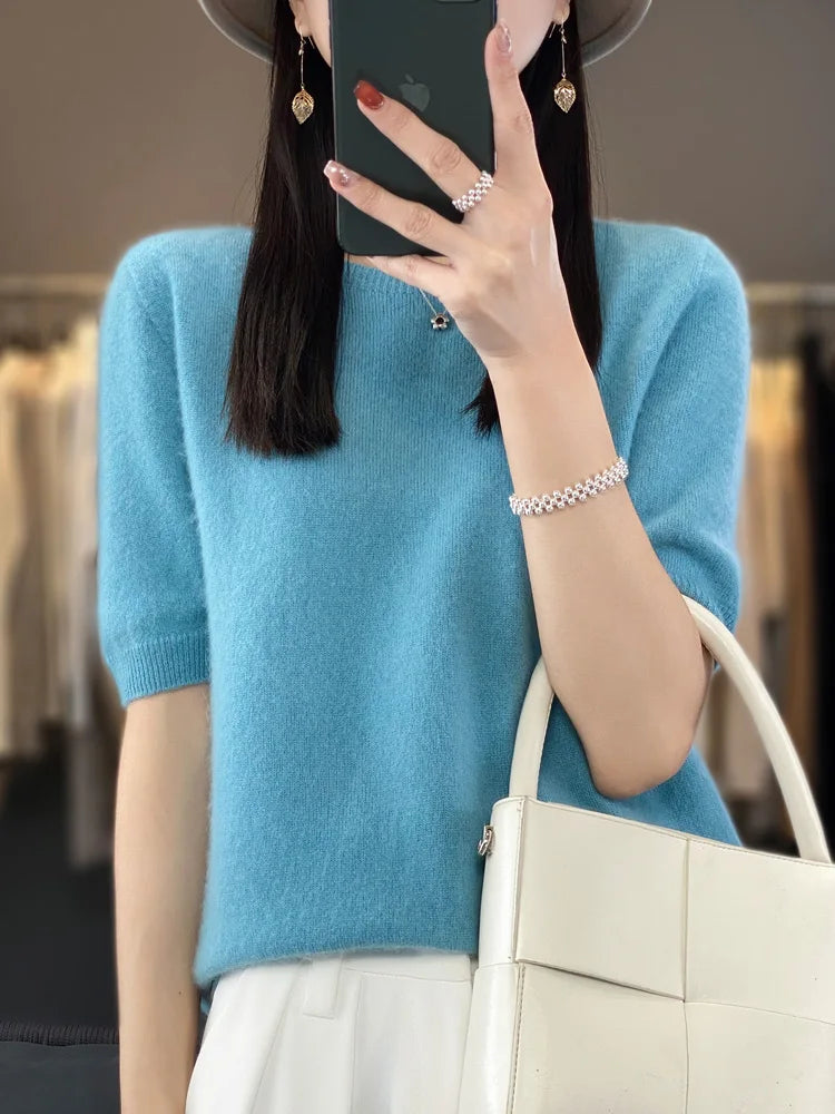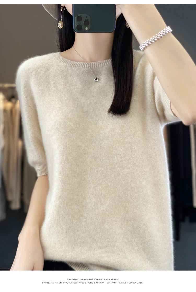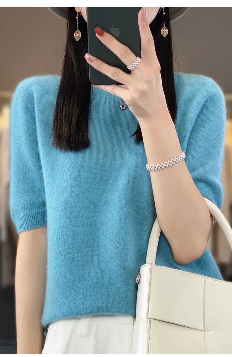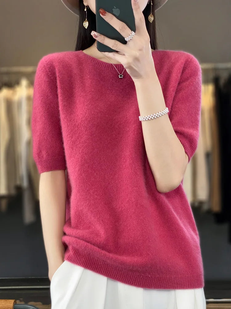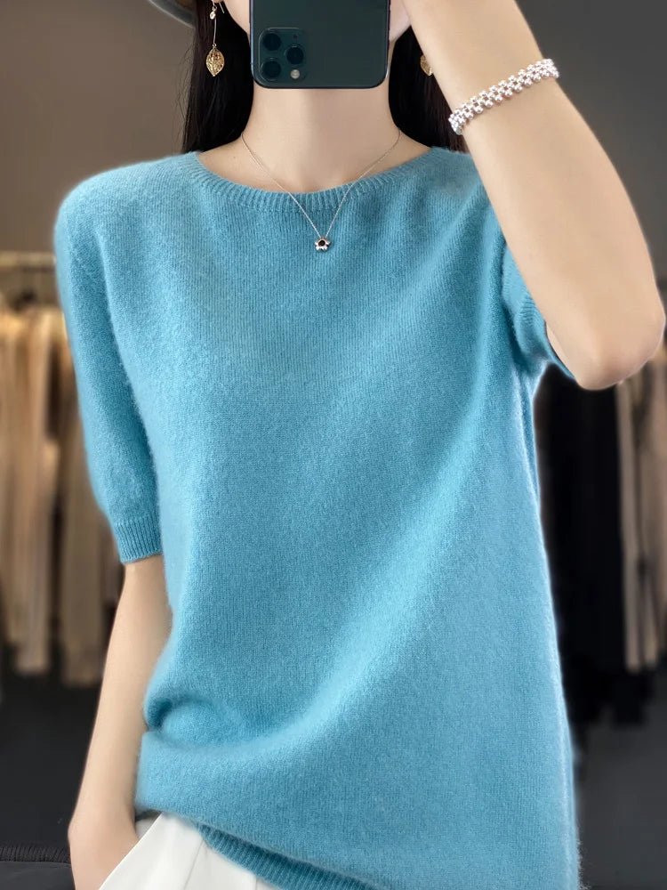 100% Pure Wool Women’s O-Neck Pullover T-Shirt – Spring Summer Loose Short Sleeve High-End Sweater Top