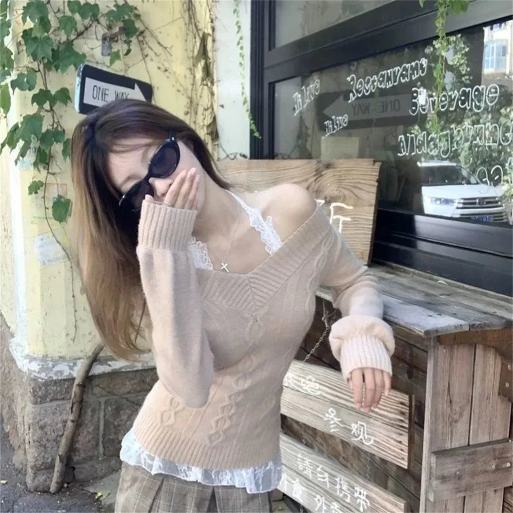 Fashion Vintage V-Neck Knitted Top Women 2025 Early Autumn Slim Long Sleeve Pullover Sweater Gray