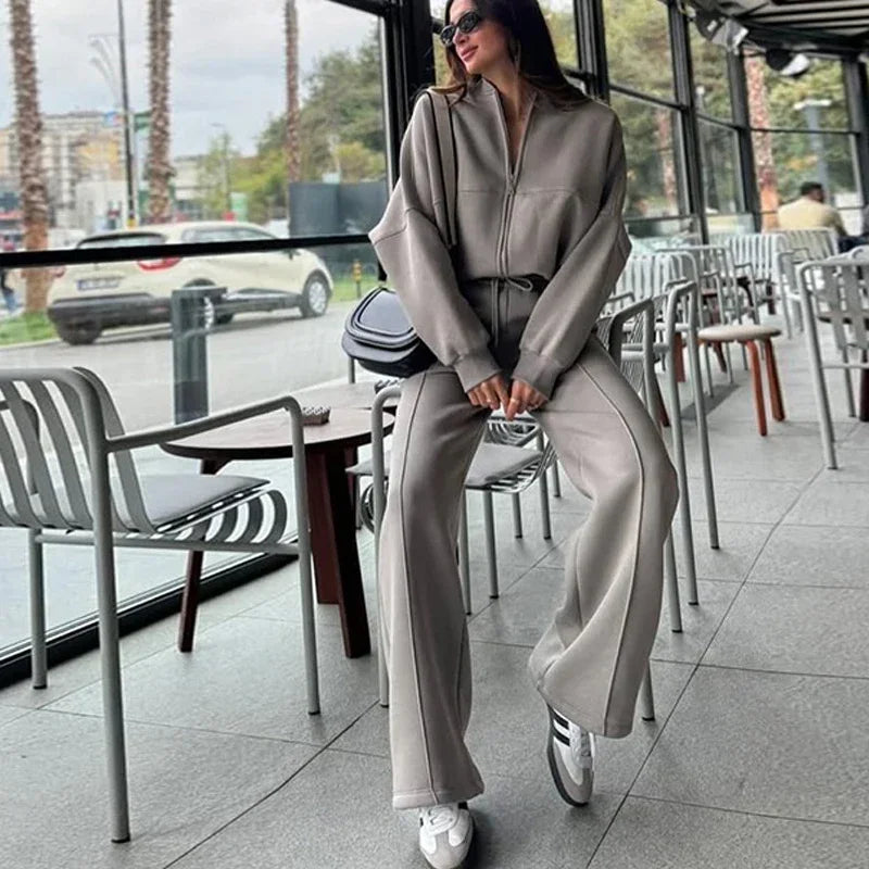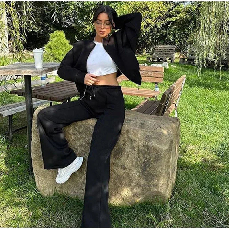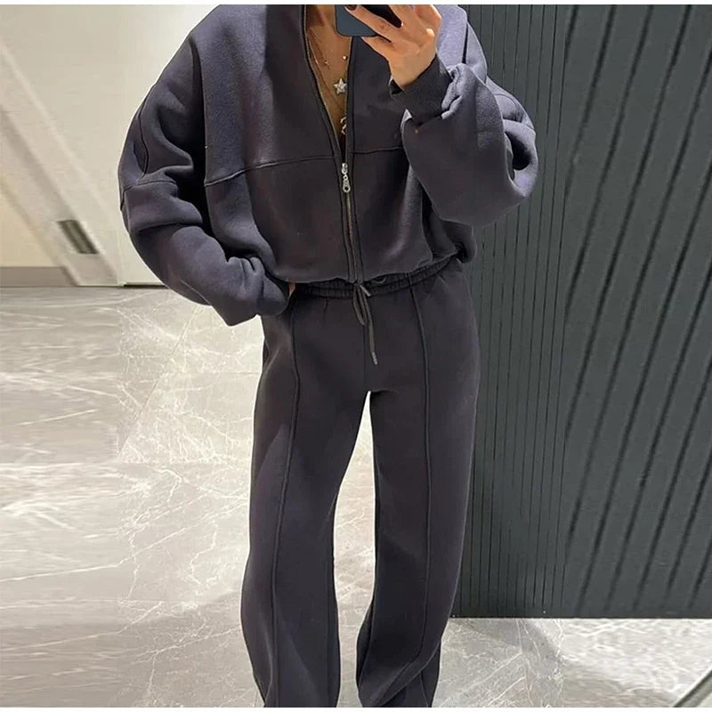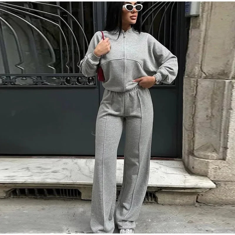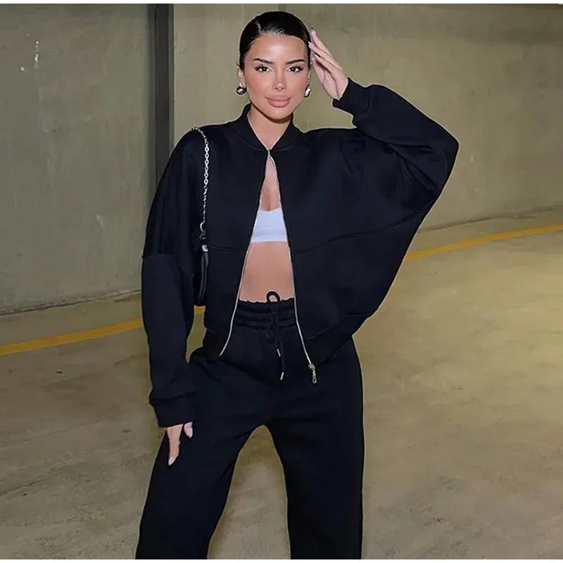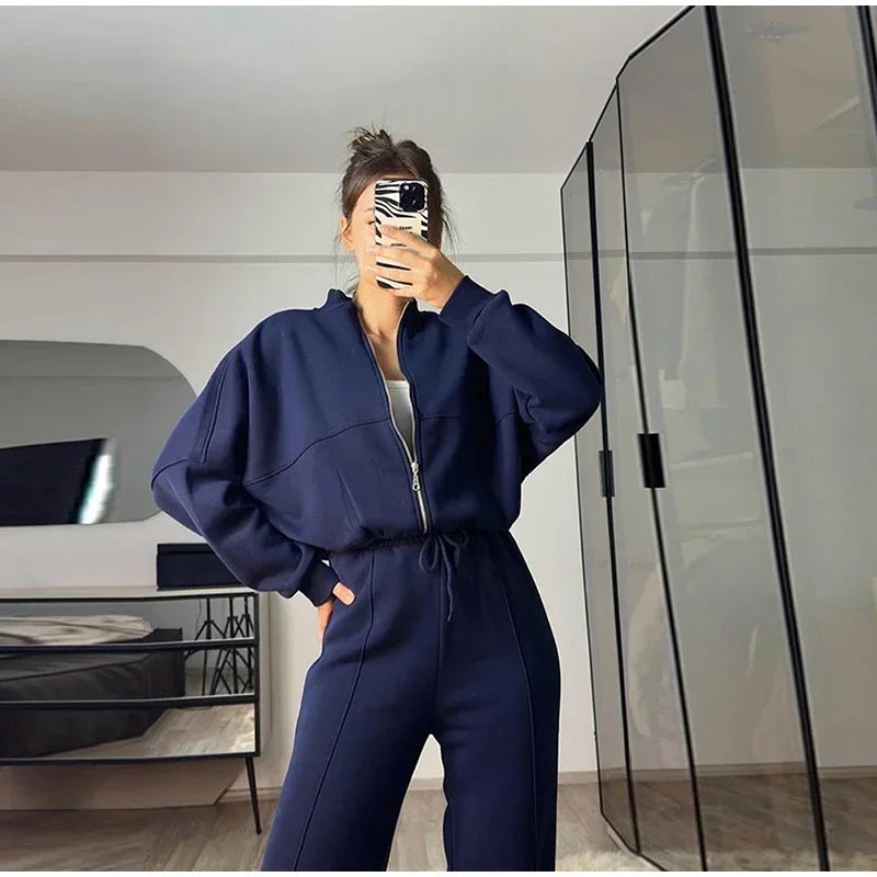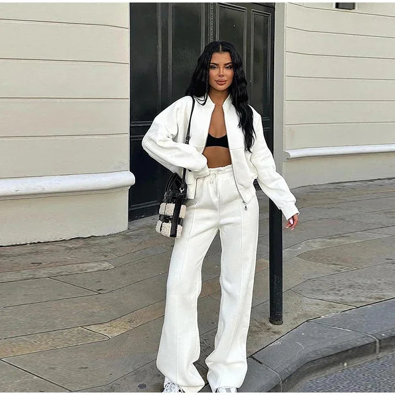 Women’s Casual Sweatshirt and Pants Set Spring Autumn O-Neck Zipper Jacket Loose Lace-Up Elastic Waist Trousers Solid Outwear