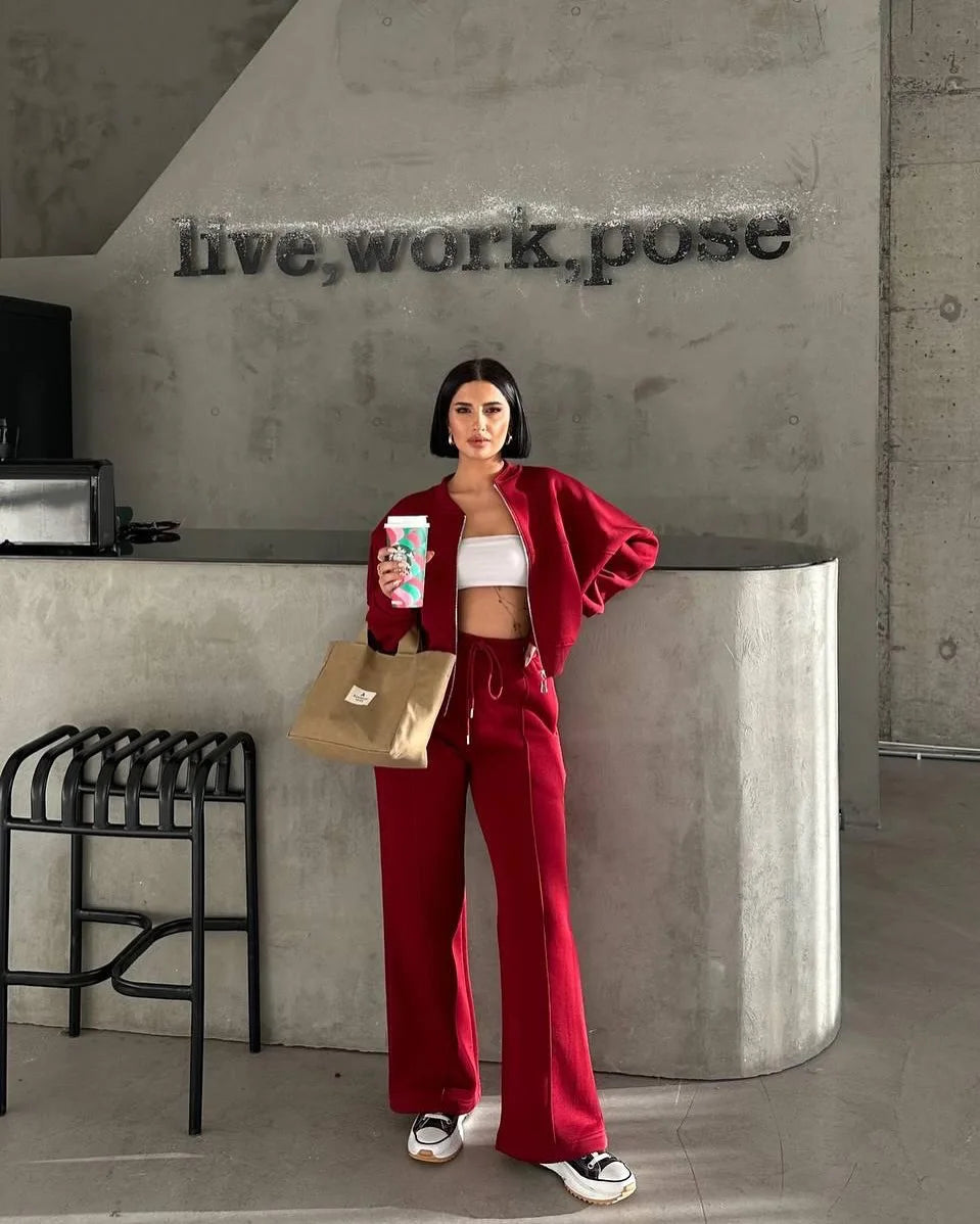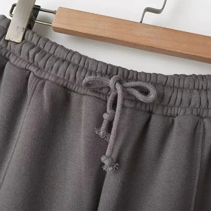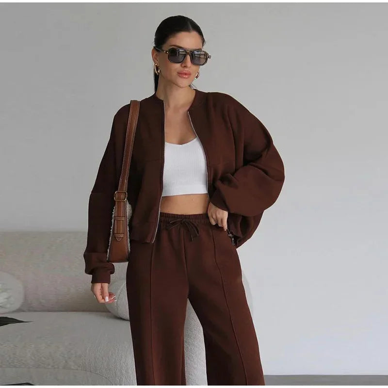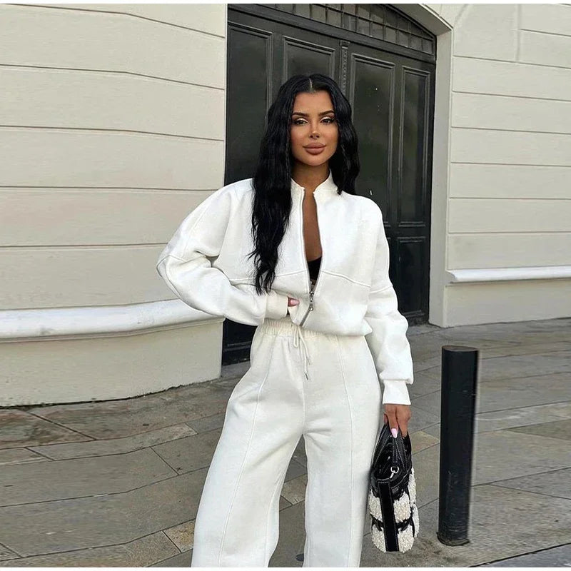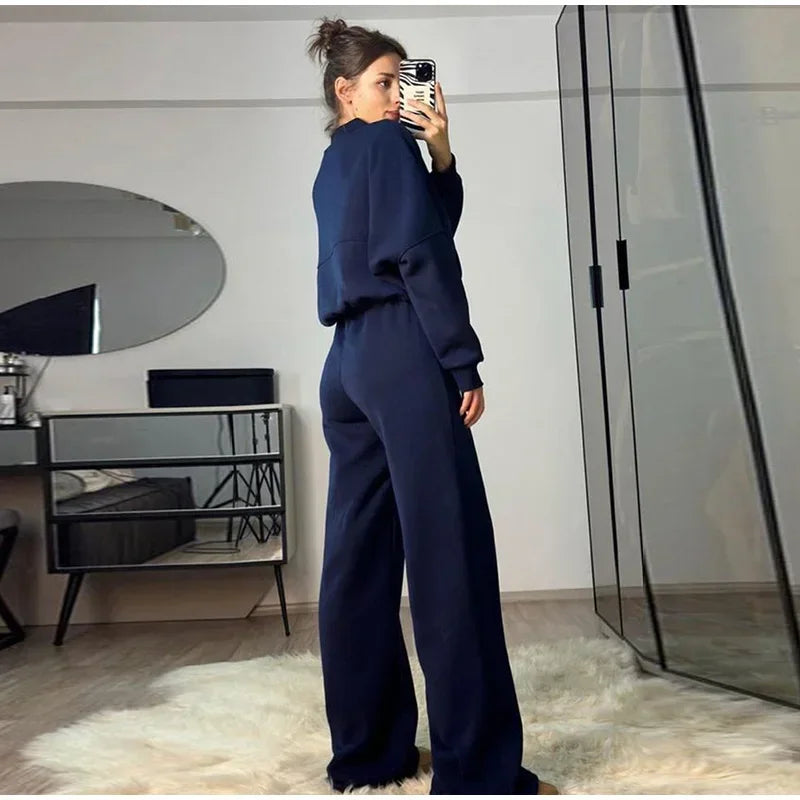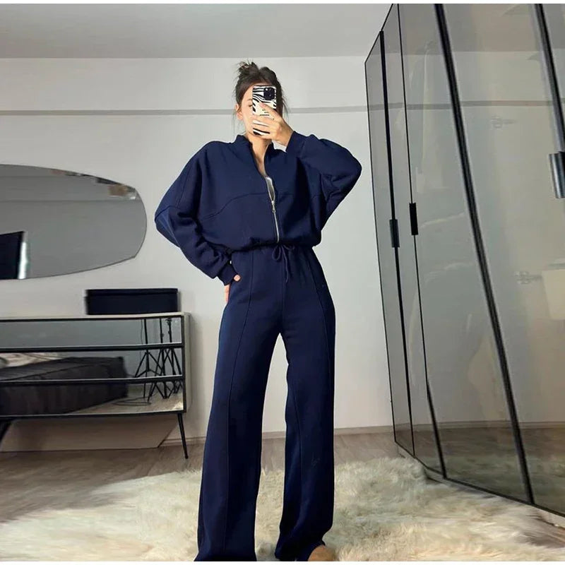 Women’s Casual Sweatshirt and Pants Set Spring Autumn O-Neck Zipper Jacket Loose Lace-Up Elastic Waist Trousers Solid Outwear