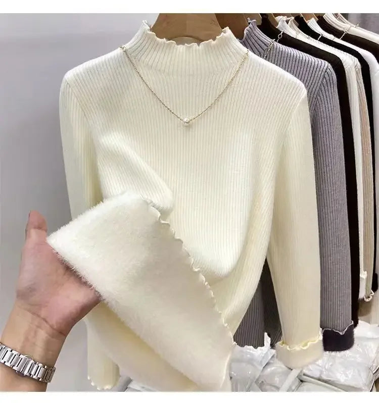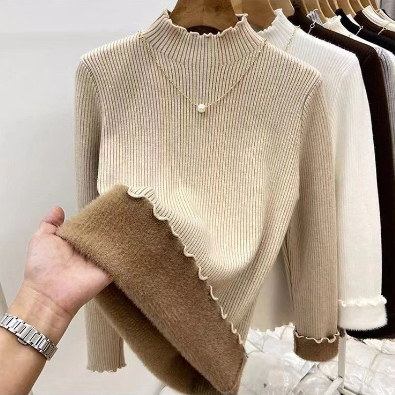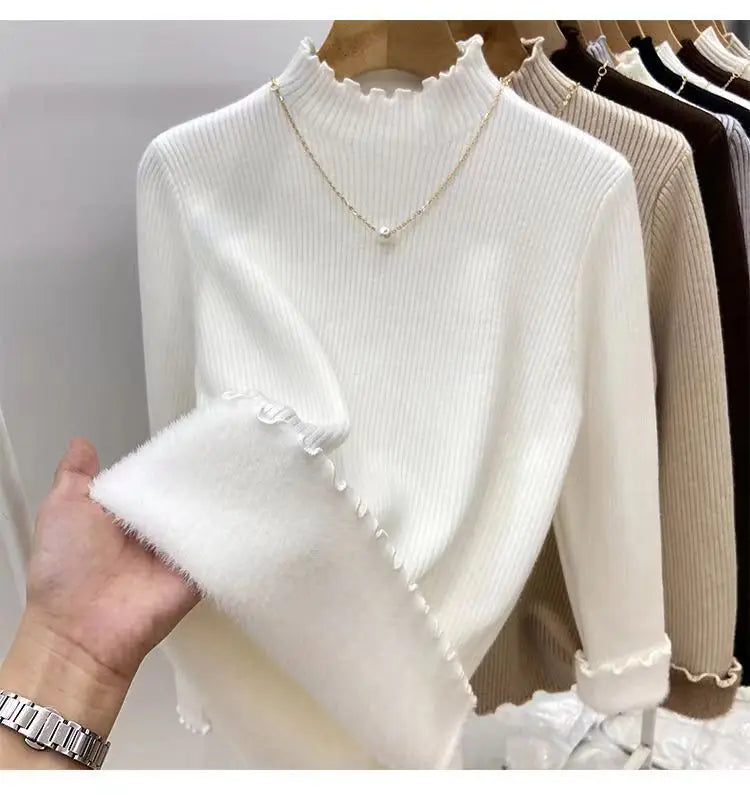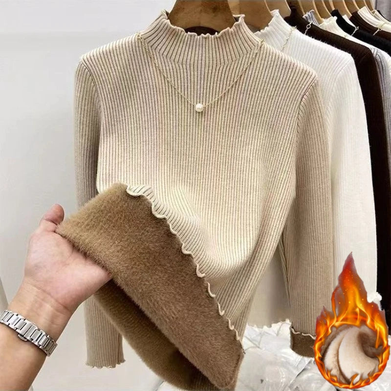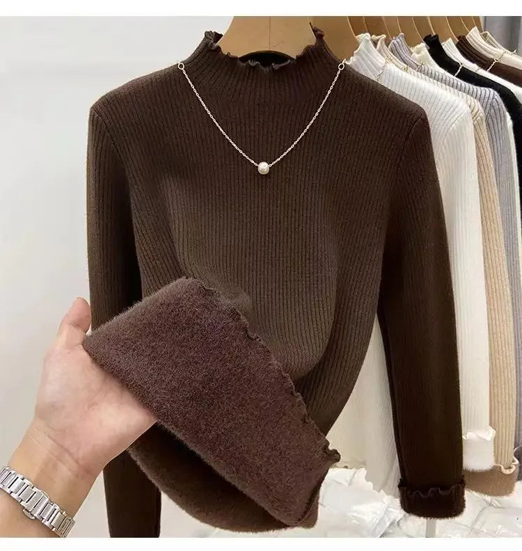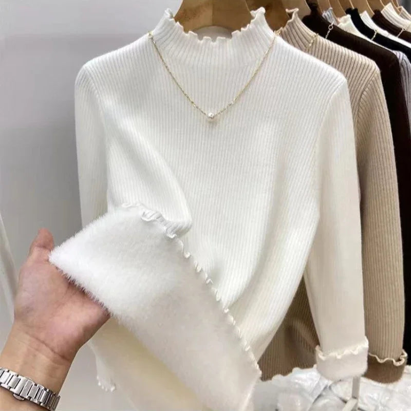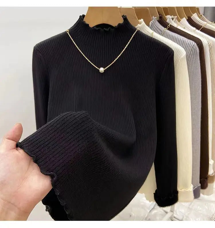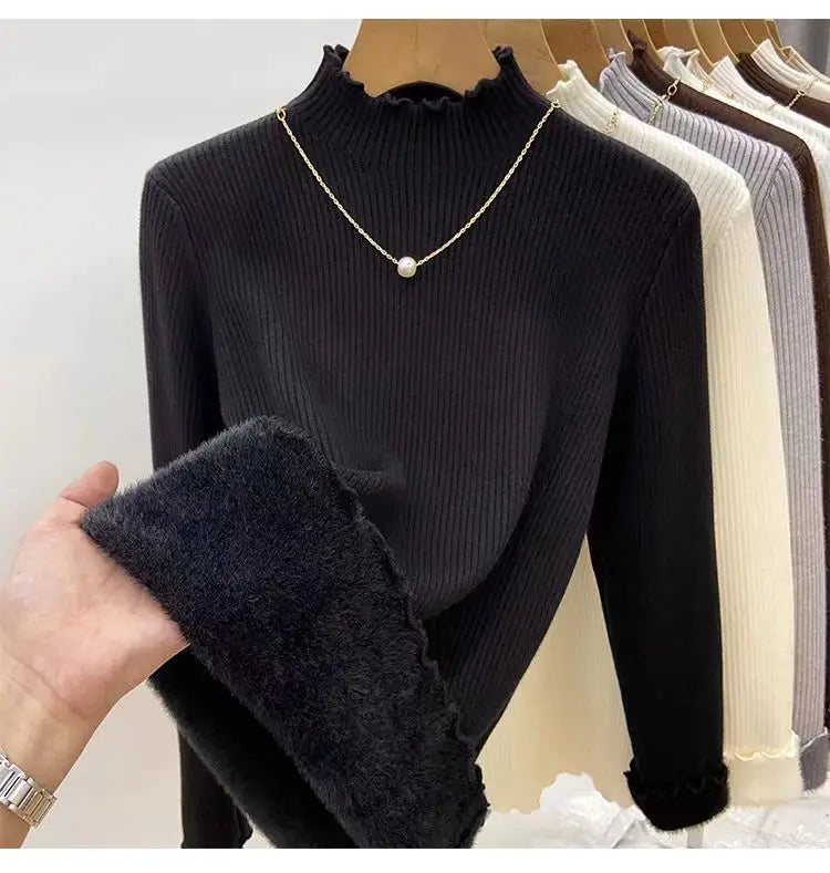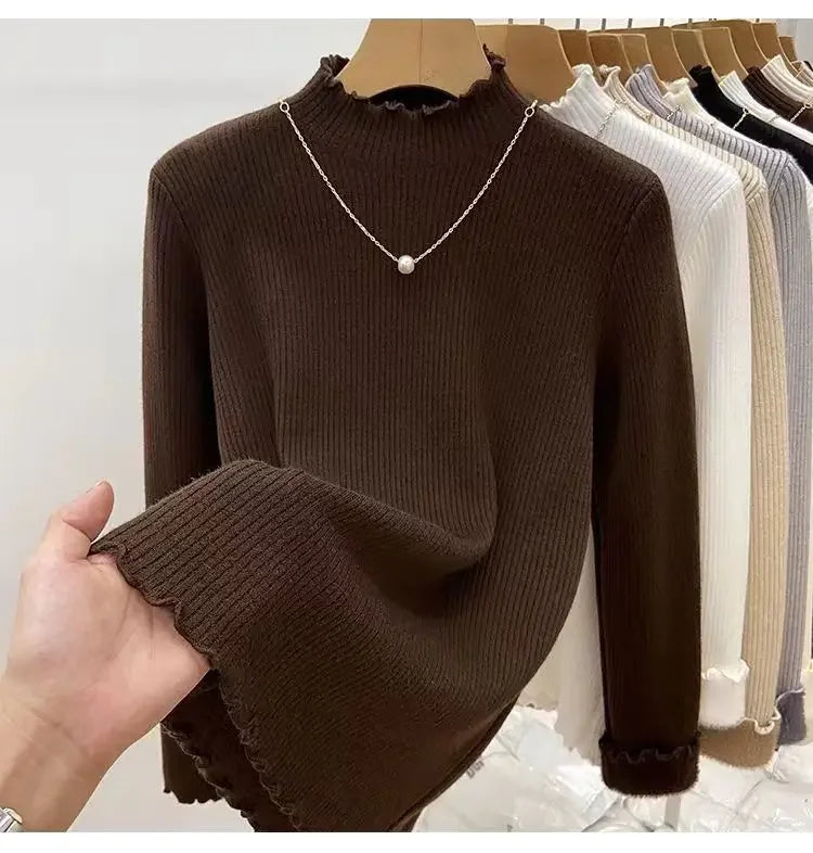 Women’s Long Sleeve Warm Ruffled Edge Sweater Thickened Fleece Lined Turtleneck Pullover Autumn Winter Base Layer Shirt