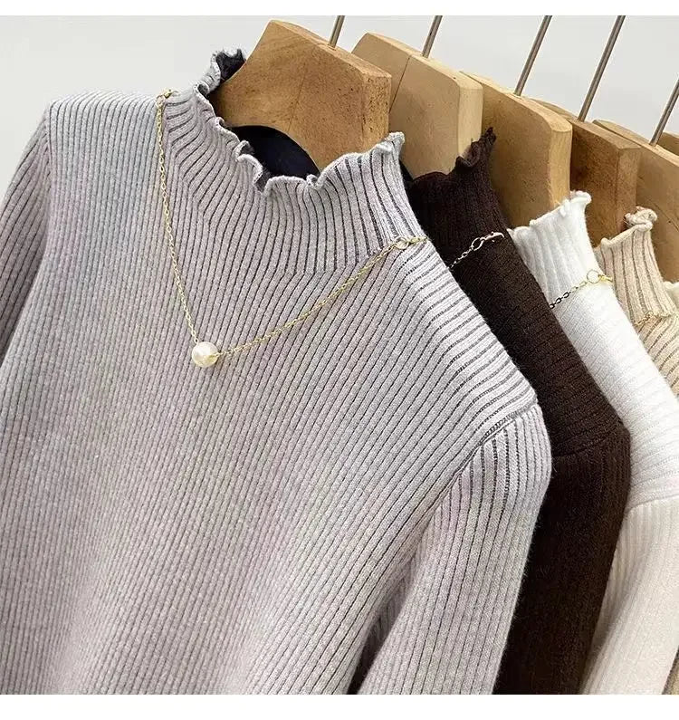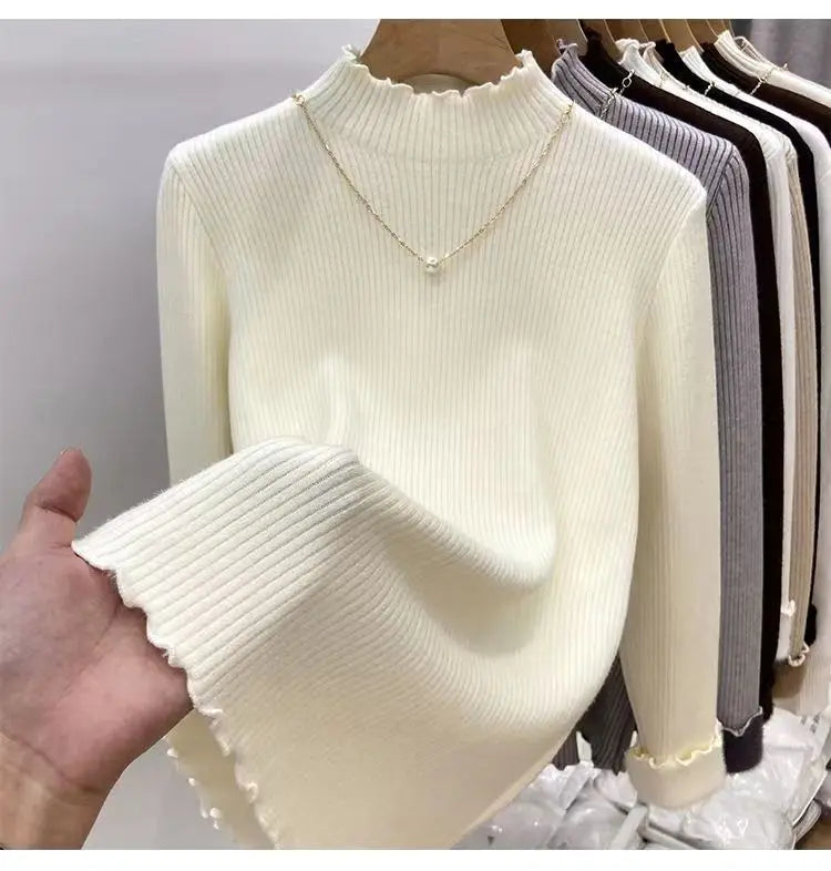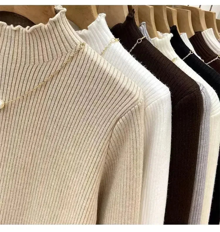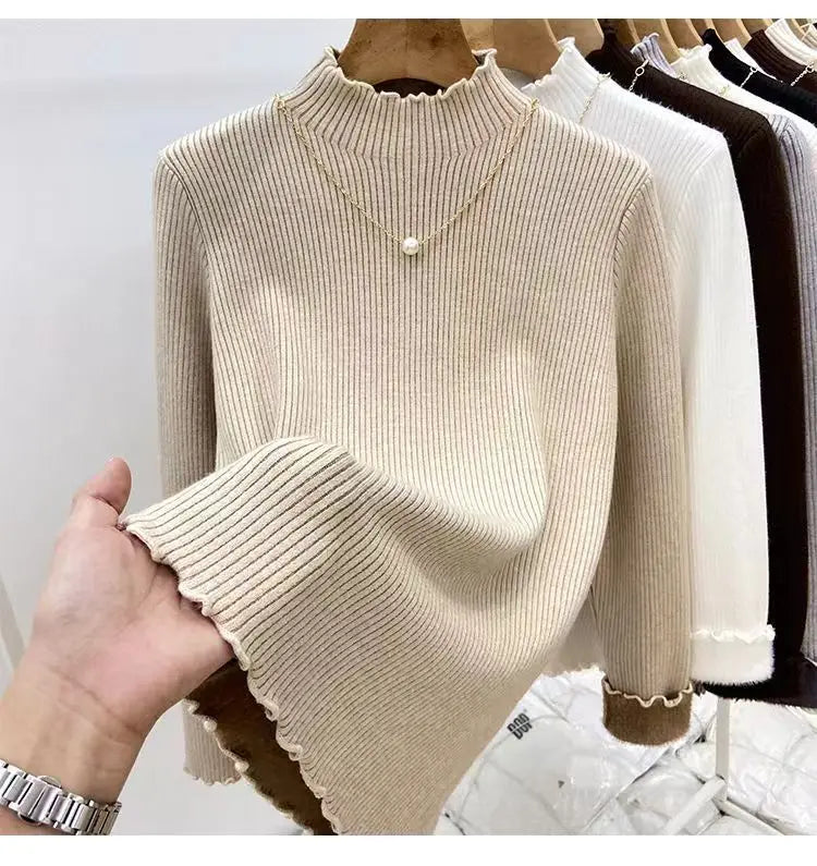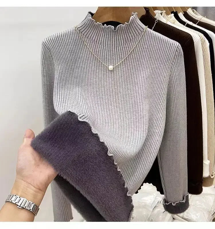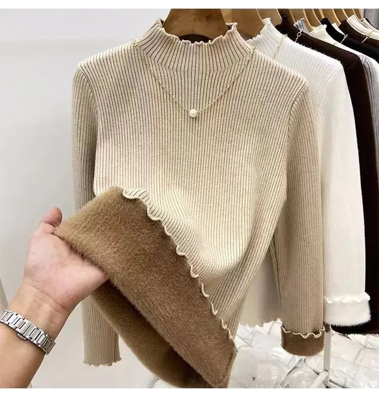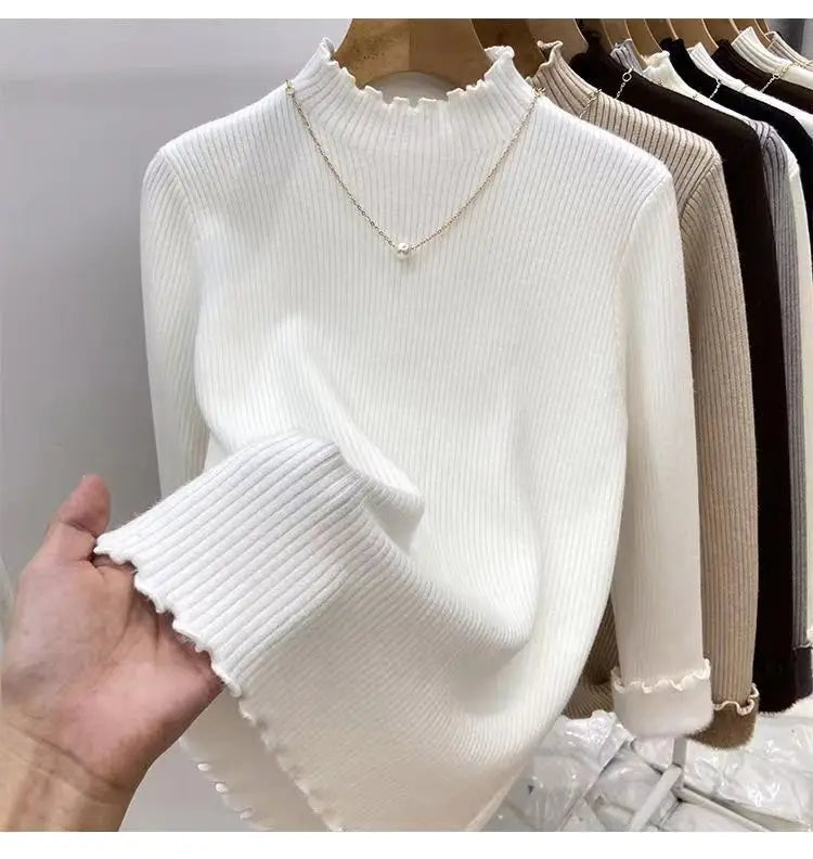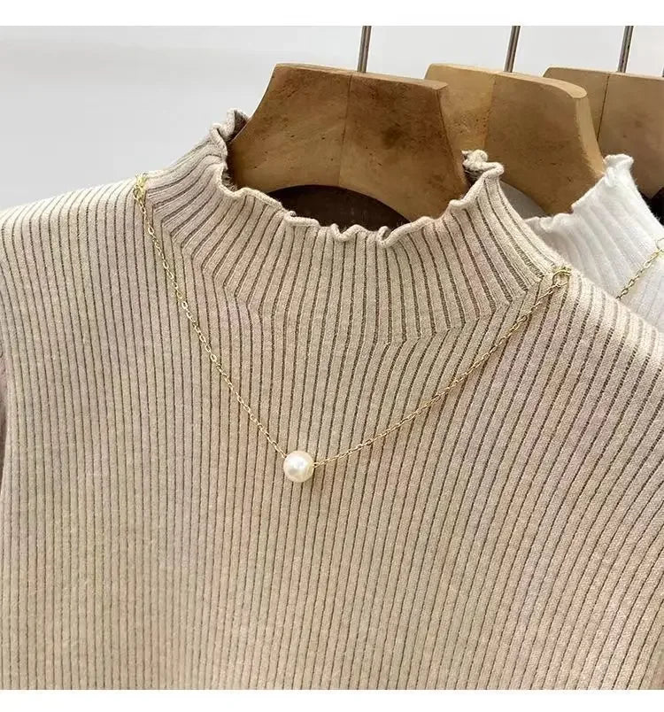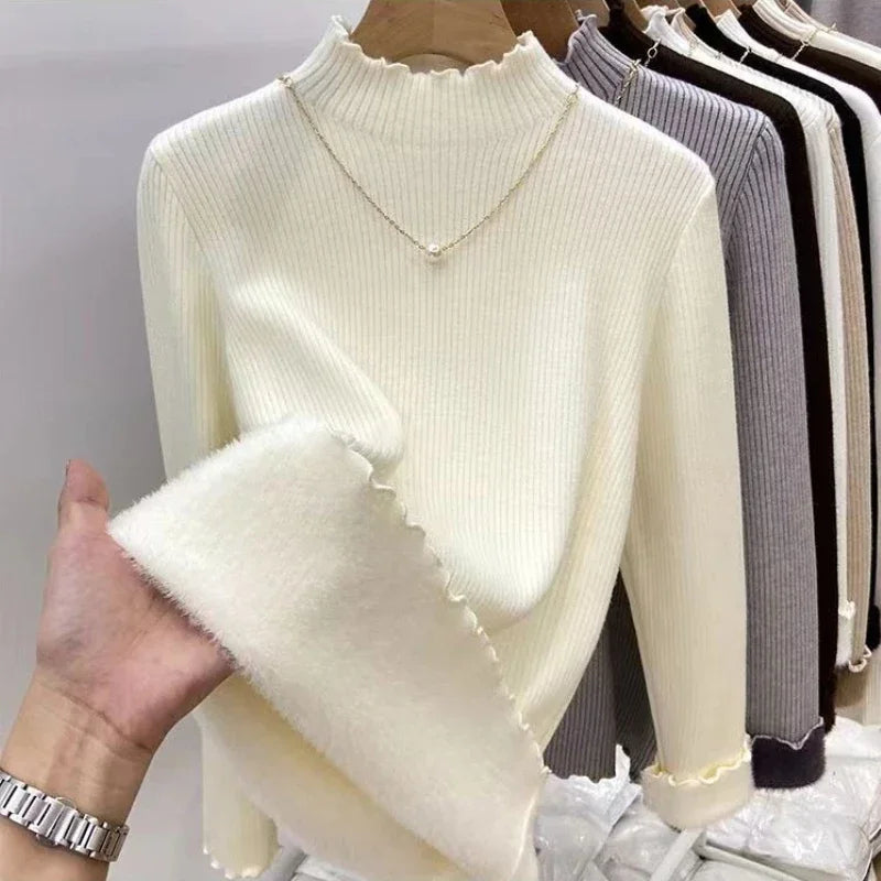 Women’s Long Sleeve Warm Ruffled Edge Sweater Thickened Fleece Lined Turtleneck Pullover Autumn Winter Base Layer Shirt