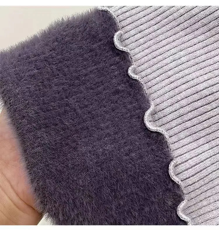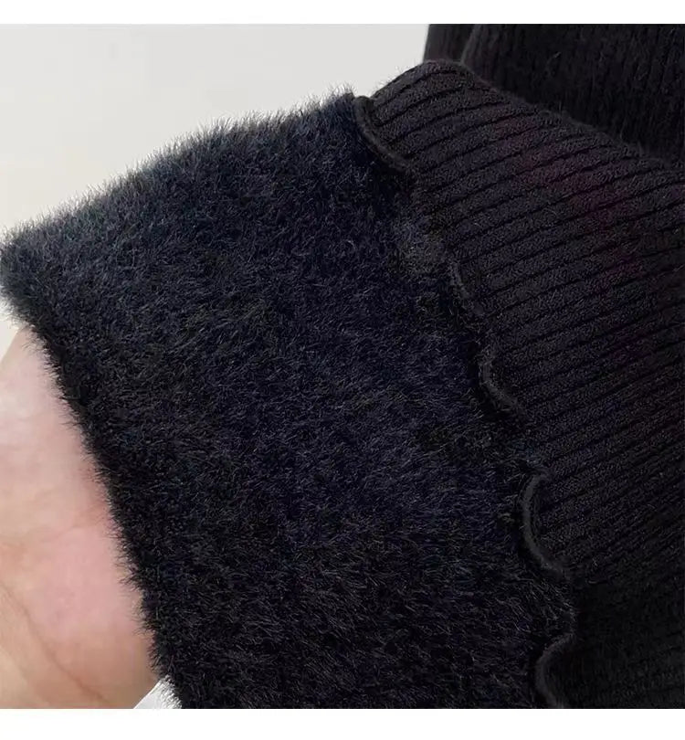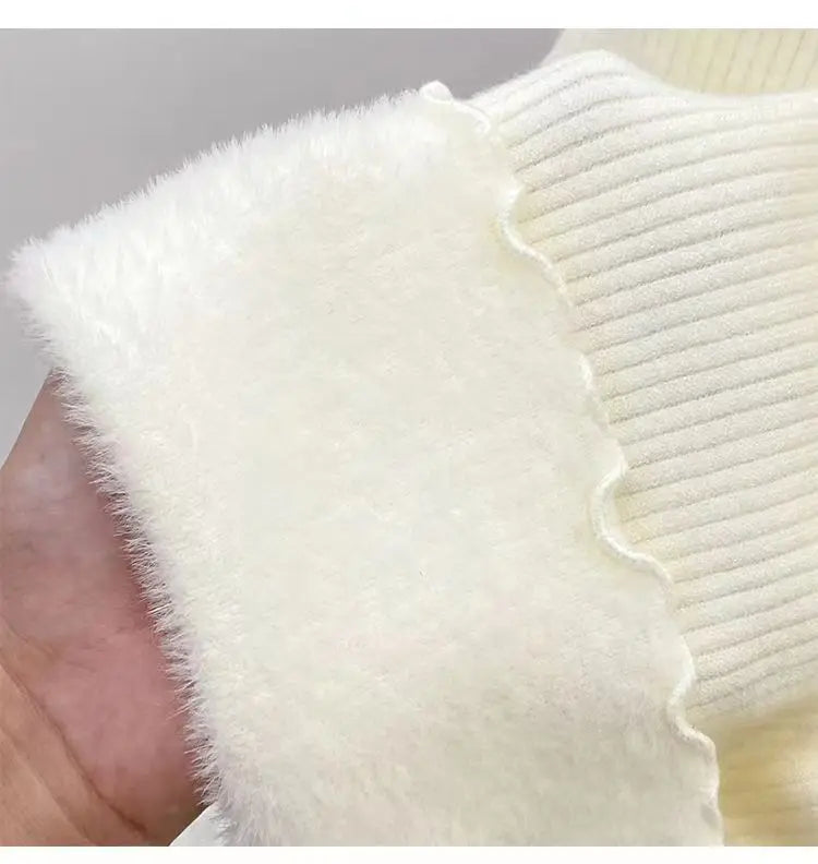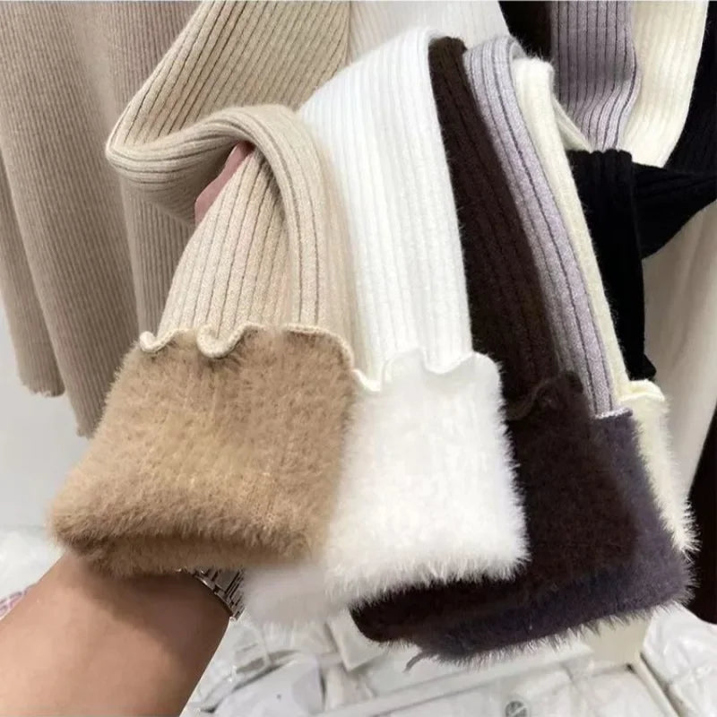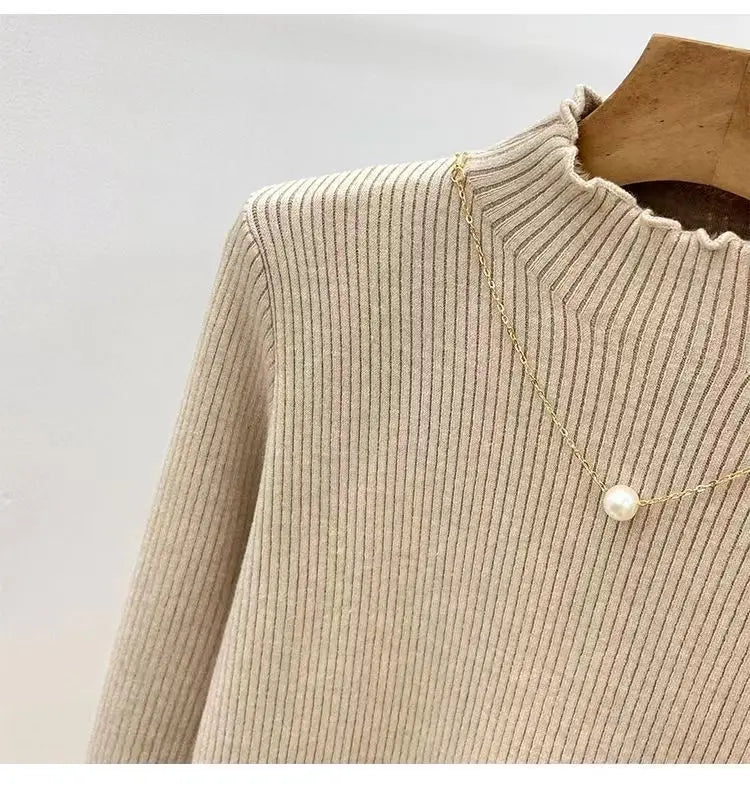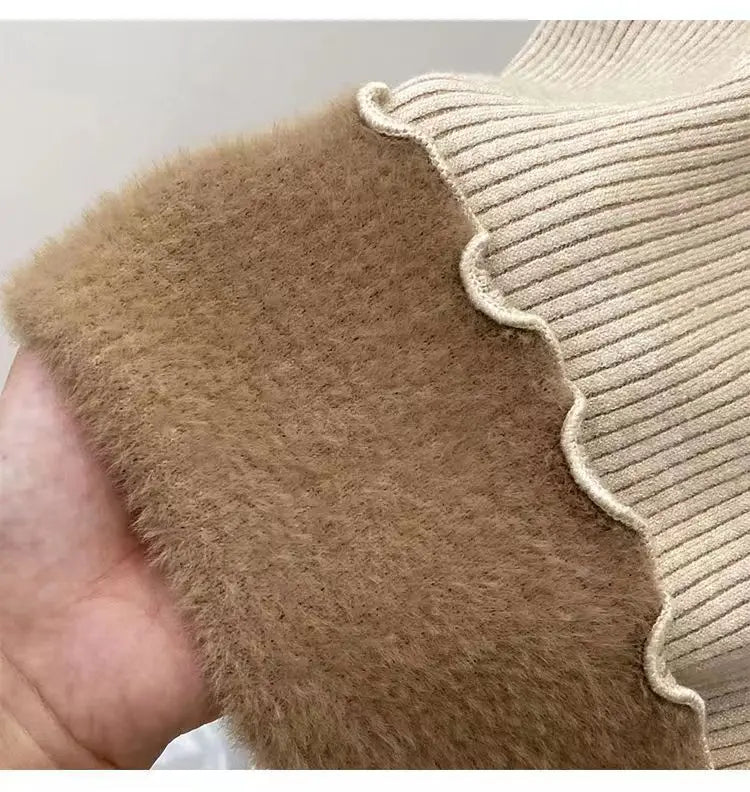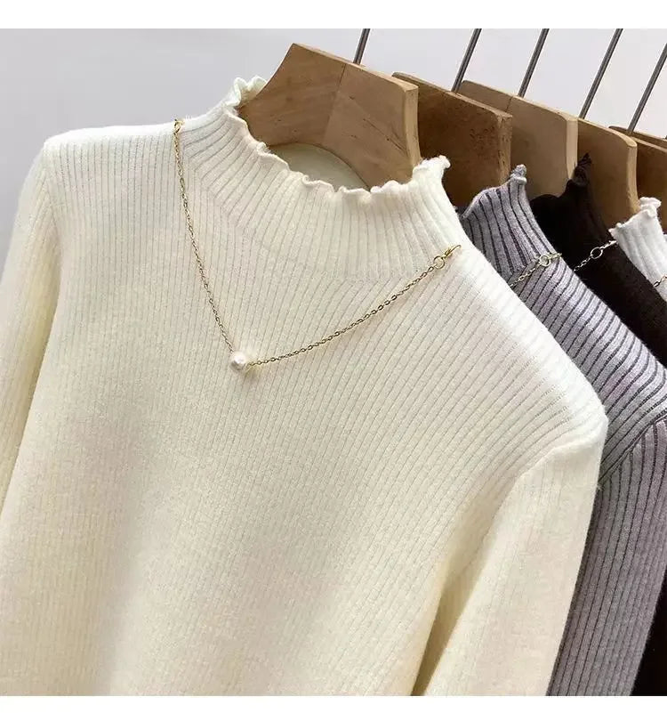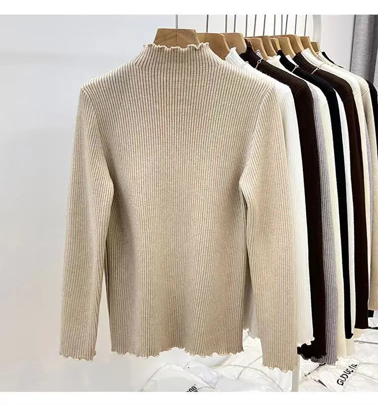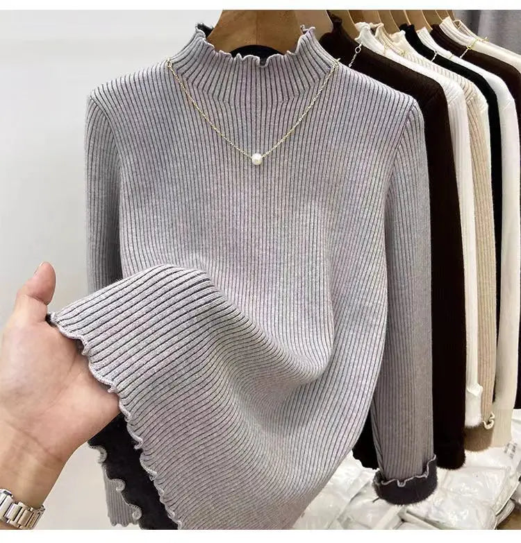 Women’s Long Sleeve Warm Ruffled Edge Sweater Thickened Fleece Lined Turtleneck Pullover Autumn Winter Base Layer Shirt